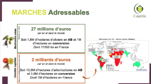 D’après une étude de marché faite avec le cabinet d’étude BVA, sur un panel de 150 oléiculteurs français, après leur avoir présenté notre solution, 56% d’entre eux sont en agriculture biologique et représente 62% des surfaces d’oliveraies françaises.